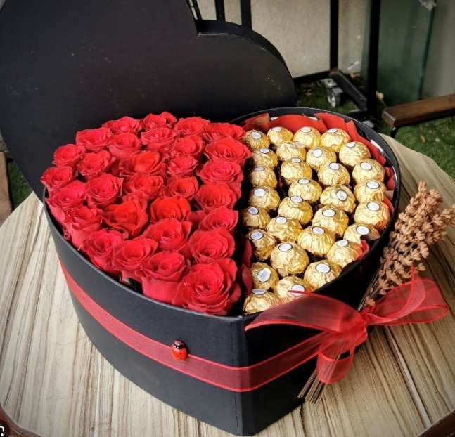 Siyah Kalp Kutuda Kırmızı Güller ve Çikolata Sunumu